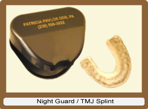 A night guard or TMJ (temporomandibular joint) splint is used to protect the teeth from grinding and helps reduce muscle tension and headaches. It is a clear plastic removable splint that is formed and fitted to your teeth and is worn at night. This splint can help with those who suffer from dizziness, headaches and excessive grinding as a result of TMJ syndrome.